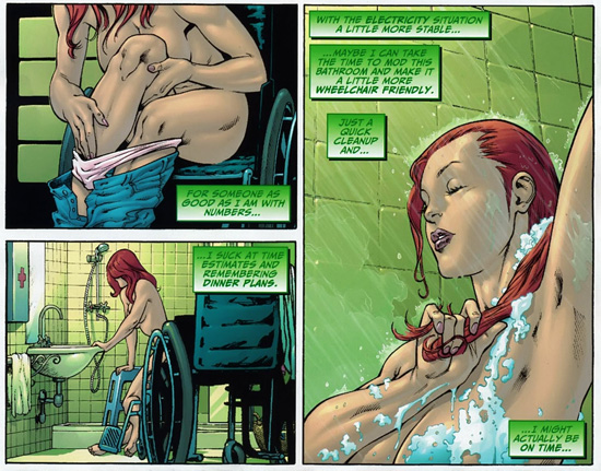 Yet even viewing Oracle as an empowered heroine embodying the dead man defrosting troupe is filled with tension as arguably this triumph can turn into another negative stereotype of disability: the “super crip”. The “super crip” “stems from the belief that life with a disability must necessarily be horrific and unsatisfying, and as such, we must admire persons with disabilities for being able to live “the way they do”” (www.trinimex.ca). In the case of Gordon, her ability to overcome her disability and excel despite her body makes her a figure to be admired and arguably her greatest super-ability is her tenacity to be able to live with her disability. In a sense, taking the dead man defrosting troupe too far and creating a superpower through admiration of being able to live with a disability, turns a possible positive to a negative. Her extraordinary “super crip” status allows her to remain sexually accessible to readers because admiration for heroes and admiration for heroism because of disability can be a fine line. Irwin and Moeller suggest that “those characters with physical disabilities that possessed special abilities were portrayed in such a way as to explain how a person needed to be exceptional to overcome the perceived barriers of physical disability” (4).Exploring the tension which rests between seeing empowerment due to disability or empowerment despite disability is especially complicated by the Oracle character because her original purpose was never to inspire any kind of admiration but merely to act as a plot device. Furthermore, exploring how the return of Batgirl and Gordon’s ability to walk adds another layer of disability and sexuality.